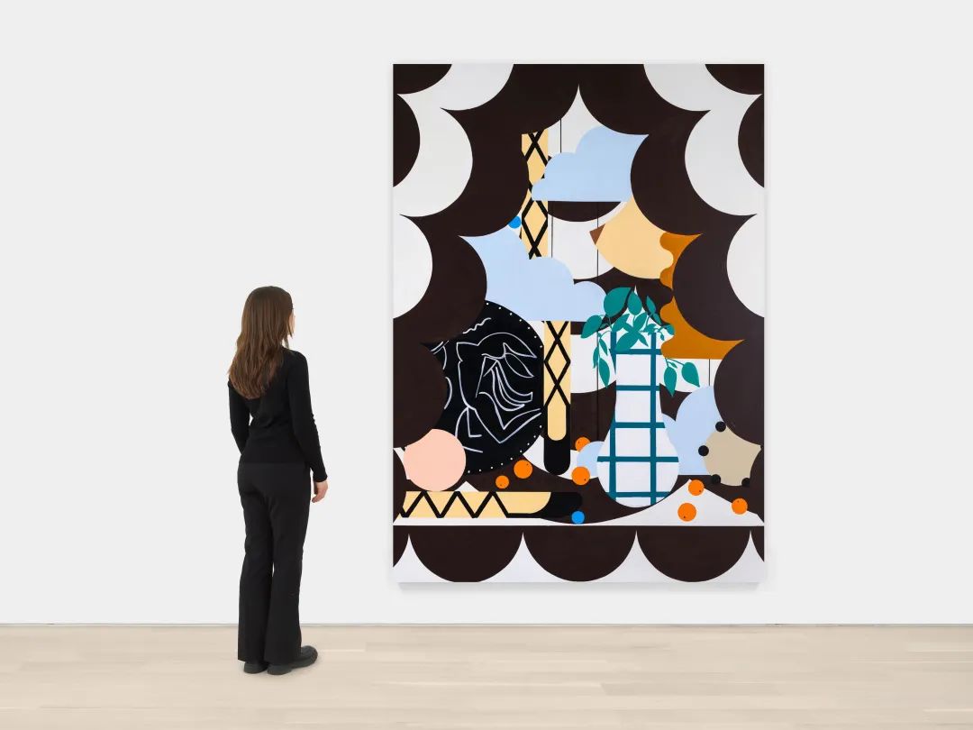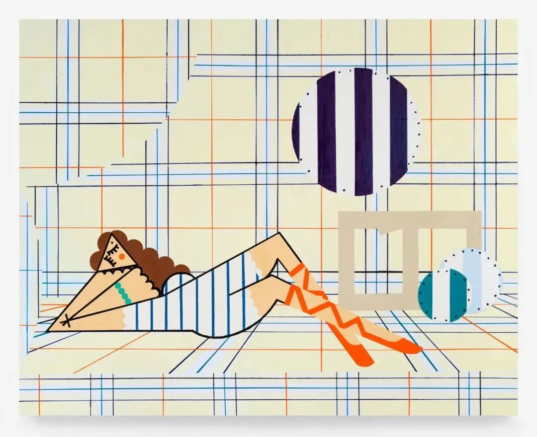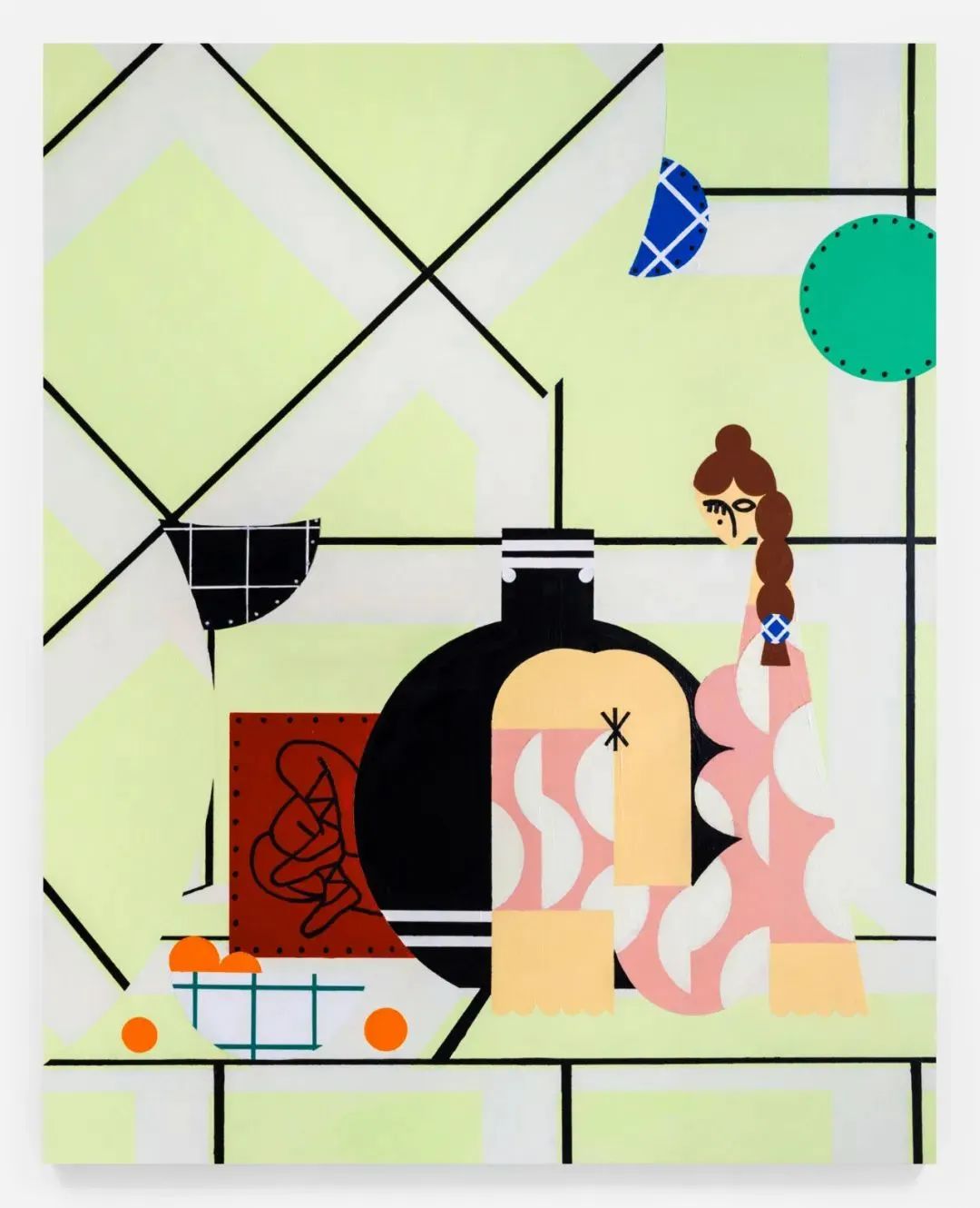 法拉·阿塔斯是画廊的代理艺术家。1981年出生于布鲁塞尔,现工作生活与法国巴黎。其绘画以鲜艳色彩为特点,通过几何形状和透视视角在画中建构出不存在的虚构空间,充满丰富的层次和视觉紧迫感,这种错觉效果为她的画面也增添了一分神秘感。艺术家采用了两个主要的方法:精心收集图像、用纸胶带贴出网格来系统地排布纹样。她的画作隐隐透露出一丝叙事性,融合了纺织图案和多色马赛克,同时借鉴了现代主义(Modernism)和民间艺术(Folk Art)。正如艺术家所说,我所做的是“将具象的绘画抽象化”。