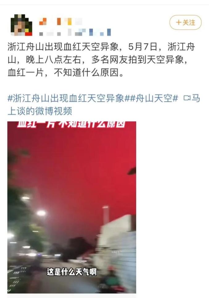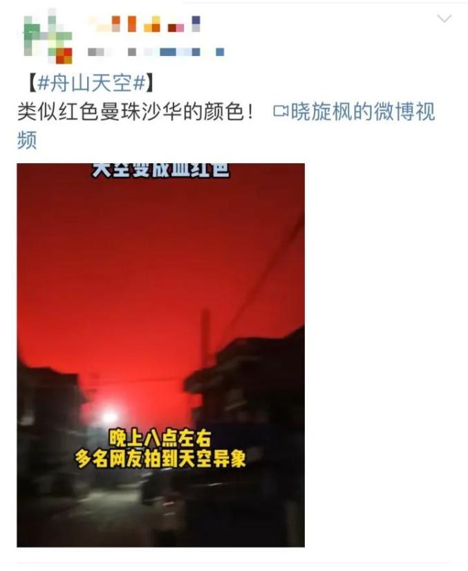 今天,舟山气象局工作人员回应说,天空呈现红色是属于光的折射和散射,当天气象条件较好,大气中水分较多形成气溶胶,光源或为港口的船舶灯光。