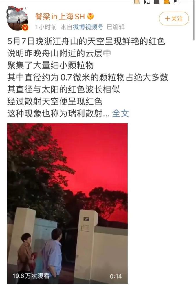 有微博红v“脊梁in上海SH”分析说这只是一种天气现象,可以用“瑞利散射”解释,“昨晚舟山附近的云层中聚集了大量细小颗粒物,其中直径约为0.7微米的颗粒物占绝大多数,其直径与太阳的红色波长相似,经过散射天空便呈现红色。”