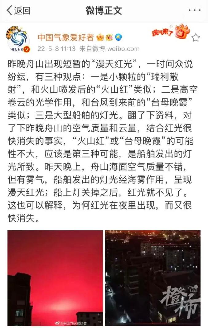 但知名科学科普博主“中国气象爱好者”对此持不同意见:“昨天晚上,舟山海面空气质量不错,但有雾气,船舶发出的灯光经海雾作用,呈现漫天红光;船上灯关掉之后,红光就不见了。这也可以解释,为何红光在夜里出现,而又很快消失。”