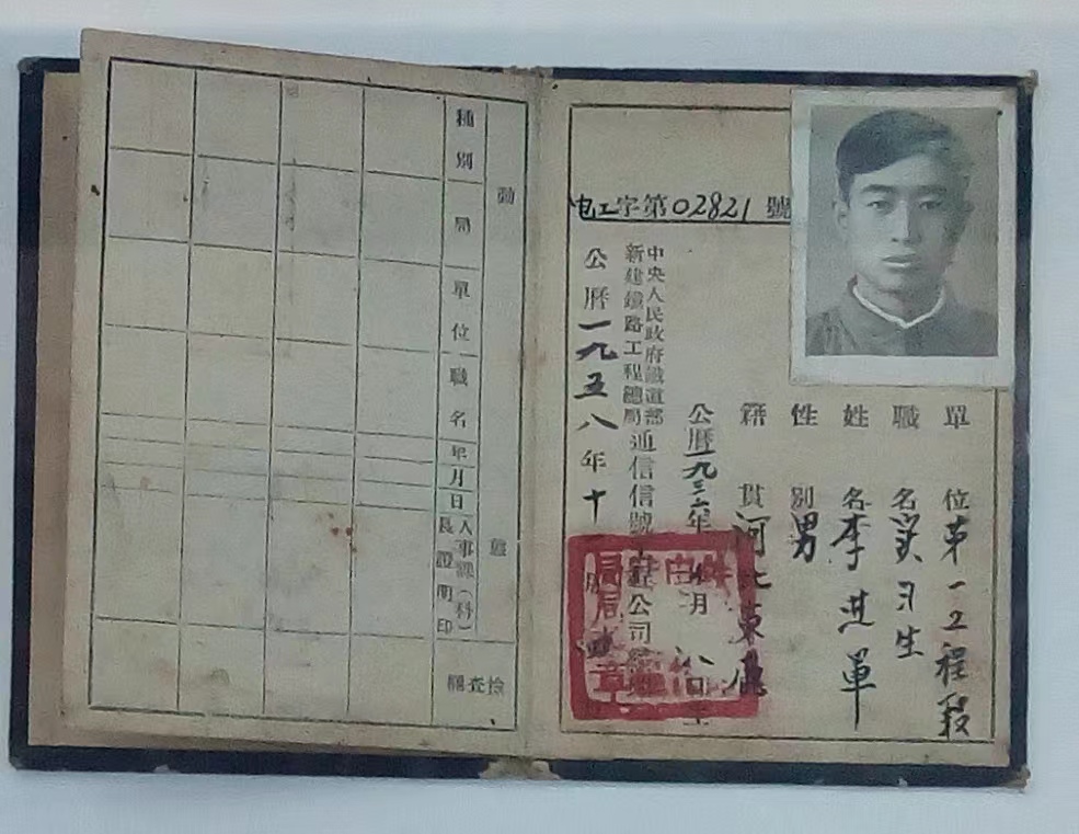 在中国中铁电气化局展览馆,陈列着见证我国电气化铁路从无到有、从弱到强辉煌历程的老物件,其中就有我姥爷李进军的工作证、会员证,还有姥爷多年使用的一只六珠算盘。姥爷1958年毕业于太原铁路物资学校,分配到铁道部新建铁路工程总局通信信号工程公司第一工程段电气化五队工作,这一年姥爷22岁,直到1996年退休,姥爷从实习生做起,历任加工班班长、材料室主任、材料厂厂长、工程段党委书记,为祖国铁路电气化事业辛勤工作了38年。姥爷是第一代电气化人,说起艰难创业的情景,姥爷总说:“‘宝成线’是电气化的根,‘宝成精神’是电气化的魂,‘促创干’是电气化人的传家宝。”