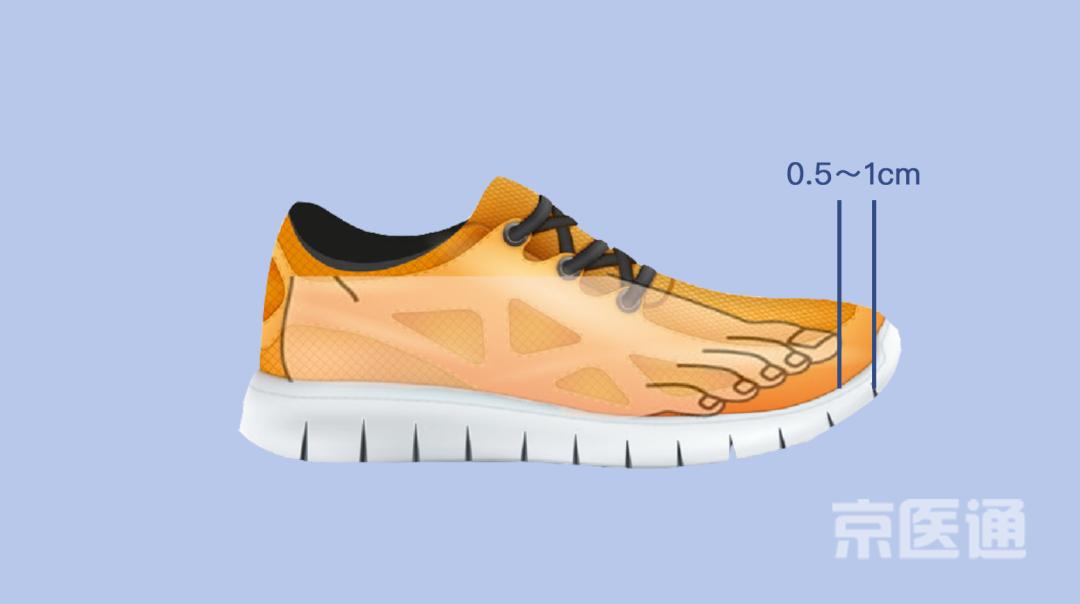 图片来源:京医通脚趾前留出的空间基本在0.5-1cm左右,预留出足够的空间让脚趾有充分的空间活动,鞋的尺寸要以最长的脚趾(主要是二脚趾)的长度为主。