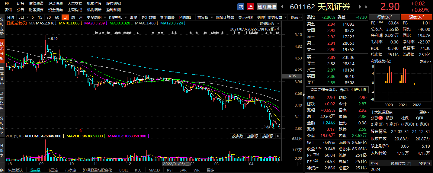 天风证券自去年下半年开始,呈现震荡下跌态势,仅2022年年内跌幅超过28%,最新股价为2.9元/股。