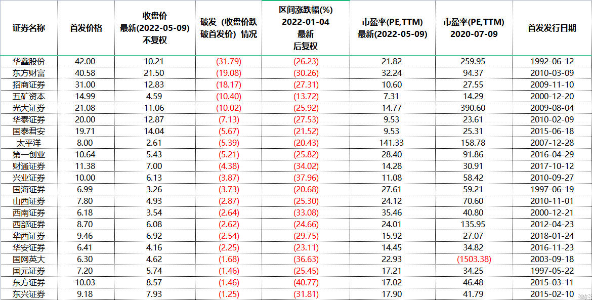 5月9日,券商概念指数微涨,年内累计跌幅逾27%。受大盘低迷,叠加股份解禁、股东减持、配股、业绩不佳等多重因素影响,年内累计跌幅超过20%的共计46只,有券商机构年内累计跌幅最高近44%,其中29只券商概念个股最新收盘价跌破上市首发价格。