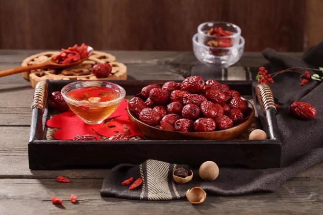 现代科学测定,鲜枣中所含的维生素C为百果之冠,每100g大枣含蛋白质3.3g,脂肪0.4g,糖类72.8g,含钙、磷、铁以及胡萝卜素、尼克酸、维生素B1、B2、C、P等,具有增强体质,延缓衰老的作用。
