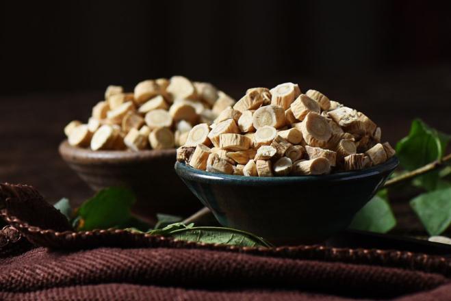 黄芪又名黄耆、戴糁,为豆科多年生草本植物黄芪和内蒙黄芪的根。黄芪适用于劳倦内伤,五脏虚衰,年老体虚,久病羸弱,心慌气短,自汗体虚,脾胃虚弱,肌肤肿胀,疮疡溃疡不生肌收口,食欲不振,气虚浮肿,中风后遗症,消渴顽疾一切气衰血虚之证。现代研究认为,黄芪主要含有甙类、多糖、氨基酸及微量元素等,具有增机体免疫功能,利尿,抗衰老,保肝,降血压,能消除肾炎蛋白尿,增强心肌收缩力,还有促雌激素样作用和较广泛的抗茵作用。其中膜荚黄芪皂甙甲具有降压稳定红细胞膜作用。