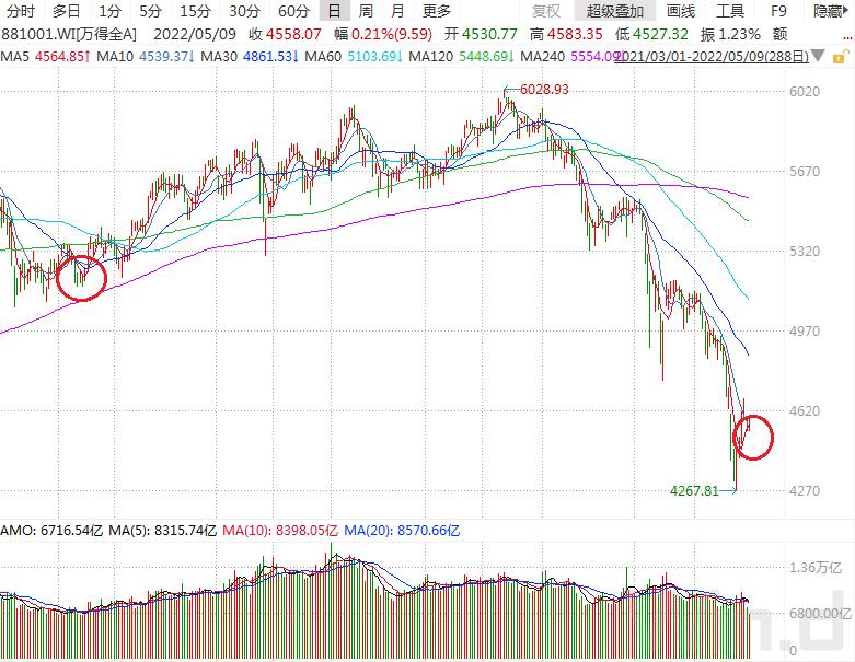 5月9日,万得全A早盘低开后窄幅震荡,全天成交额为6717亿元,较前一交易日大幅缩量,同时也创2021年4月份以来新低。虽然5月9日当天北上交易暂停,即使剔除相关因素影响,市场大幅缩量仍然十分显著。从A股历史经验来看,地量往往见地价,在去年4月份成交量见底后,市场迎来一波长达10个月的震荡反弹行情。
