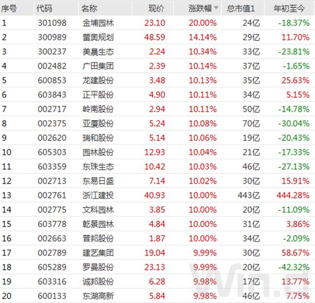 特别是建筑装饰板块内个股呈现出批量涨停态势,金埔园林、蕾奥规划、美晨生态、广田集团、龙建股份、正平股份、岭南股份、亚厦股份、瑞和股份、园林股份、东珠生态、东易日盛、浙江建投、文科园林、乾景园林、普邦股份、建艺集团、罗曼股份、诚邦股份、东湖高新等20多只个股涨停或涨幅超过10%。