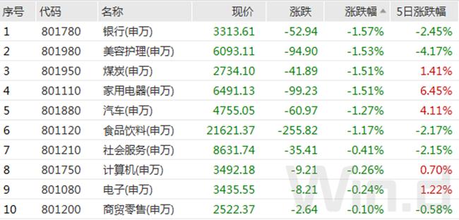 从下跌板块来看,银行、美容护理、煤炭、家用电器、汽车、食品饮料等多个板块跌幅超过1%。