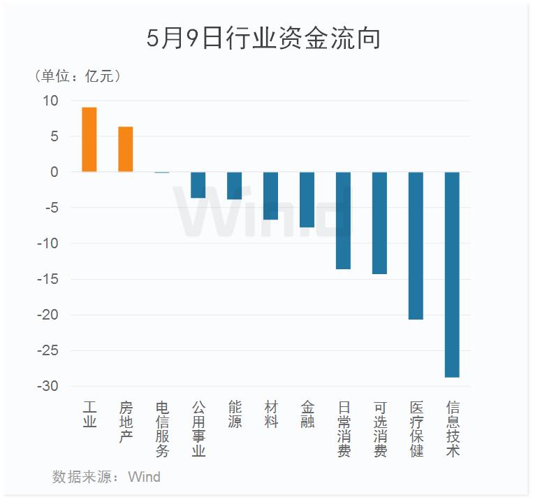 // 主力资金净流出80多亿元 //从5月9日行业资金流向来看,主力资金净流出80多亿元,多数行业净流出,其中信息技术板块净流出额超25亿元,位居首位;医疗保健、可选消费、日常消费等板块净流出额亦较多。仅工业、房地产板块小幅净流入。