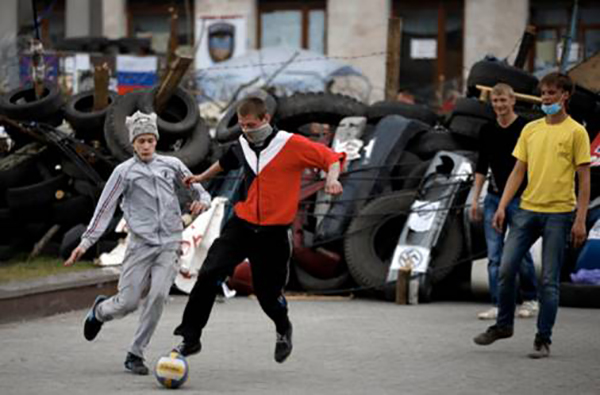 2014年4月,“顿涅茨克人民共和国”脸书主页上发布了一张照片,顿涅茨克民兵在一处街垒前踢足球。