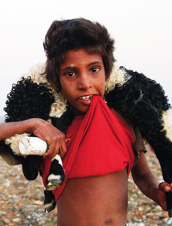 我们此行发生了一段小插曲,虽然算不上什么轰动新闻,却也揭开了索科特拉岛的神秘一角。在岛上日行夜宿,我们主要吃罐头食品,用火加热后就着米饭或本地面包果腹。偶尔也能从附近村庄买点新鲜的肉或鱼打打牙祭。那一晚,我们在山景如画的霍姆希尔 (Homhil)营地里正挤作一团,有人送来一只咩咩叫的黑山羊。不到 一小时,这只原本毛茸茸的动物再次登场,已变成了油花花的热汤和一大盘炖肉。