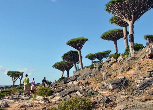 每当我们意识到脚下这块土地是全世界独一无二的,兴奋之情便无以复加。第三天,我们开始了通往费尔姆欣(Fermhin)森林的上山之路,那里就是该岛最大的龙血树聚生地。我们手脚并用地沿石灰岩陡坡攀爬,终于登上一片大平地——耸立在眼前的是成千上 万株“天生异象”的龙血树,仿佛地上插满了巨伞而伞盖一律朝上反翘,多节的枝桠如伞骨般向四面八方伸展,一直辐射到视野尽头。 穿行其中,似已出离凡尘,闯入了一个壮美又怪诞的奇境异界。
