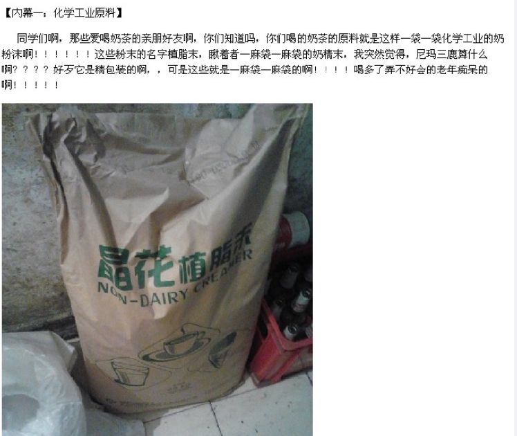 “你喝的奶茶,就是这样一袋一袋化学工业的粉末啊……”