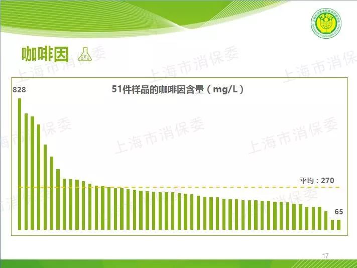 检测发现,51杯样品的咖啡因含量平均高达270mg/L,最高的更是达到了828mg/L。甚至有4杯的咖啡因含量高于300mg,最高的一杯含量竟高达428mg!