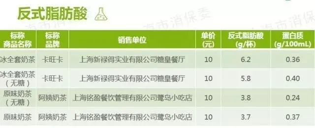 而且和街边奶茶店一样,本次检测发现,一些奶茶的蛋白质含量明显偏低,反式脂肪含量却严重超标,有的竟高达6.2g每杯!