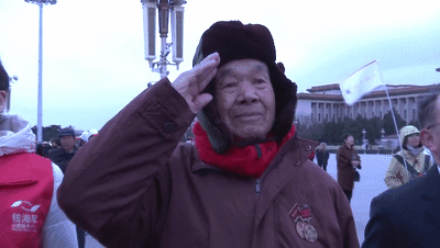 ▲钱海军在升旗仪式现场。时年90岁的他,曾参加过抗美援朝和辽沈战役。