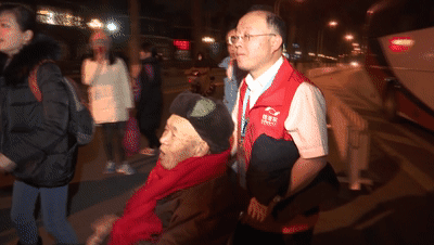 ▲钱海军送老人前往升旗仪式现场。钱海军是国家电网的一名普通职工,也是这场特殊旅行的组织者。
