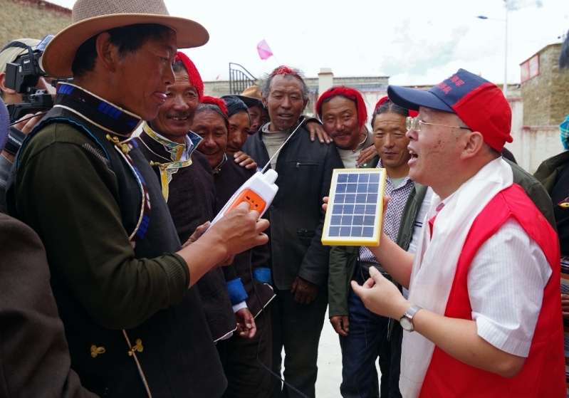 ▲钱海军把太阳能发电设备分发给西藏游牧民。