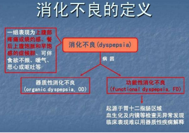 而功能性消化不良FD的具体定义为:在过去的半年内,持续性或反复出现消化不良的症状超过3个月,而消化内镜检查找不出任何的器质性病变,并且这些症状无法通过排便进行缓解。