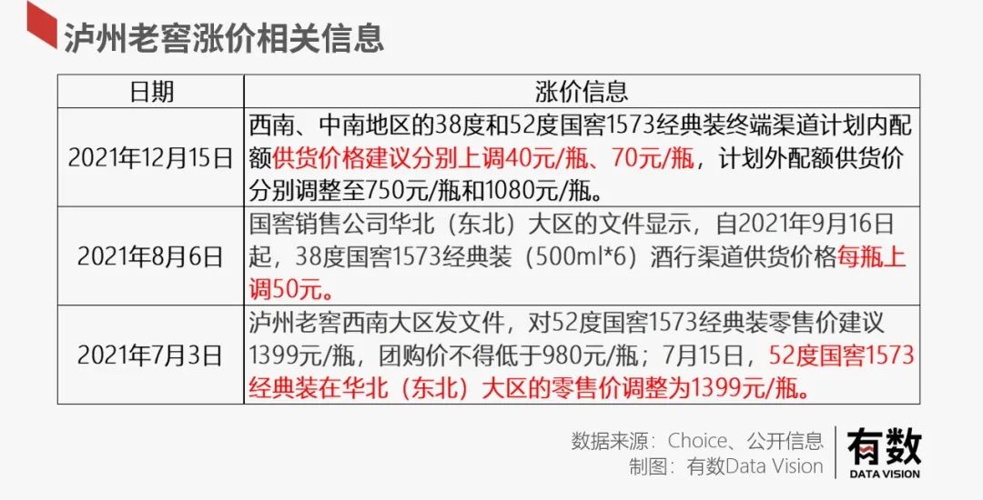 另一高端品牌,泸州老窖也频频提价。泸州老窖的核心大单品国窖1573,提价密度更高,各地区均纷纷提价。除此之外,泸州老窖的中国品味,定价2988元,也展示出冲击超高端市场的态度。