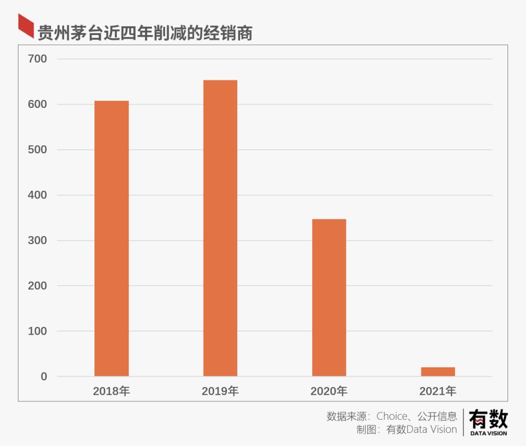为实现提直降代,茅台进行的渠道整合主要体现在两方面。第一,整合线下经销商,削减线下经销商数量,自2018-2021年以来,茅台每年都有对经销商进行删减。从下图的变动情况来看,经销商渠道改革基本已经完成。