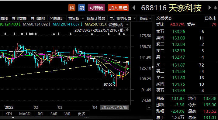 5月12日,天奈科技收盘价为131.87元/股,当日股价下跌2.48%,总市值306亿元。5月以来,天奈科技股价上涨14.66%。天奈科技在2022年一季度末被101只基金持仓5601.75股,占流通股比例为31.22%。