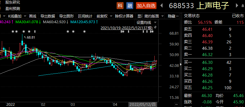 5月12日,上声电子报收46.3元/股,当日股价微跌0.17%,总市值74.08亿元。5月以来,上声电子股价上涨8.08%。一季度末,共有18只基金持有该股票,占流通股比例为23.57%。