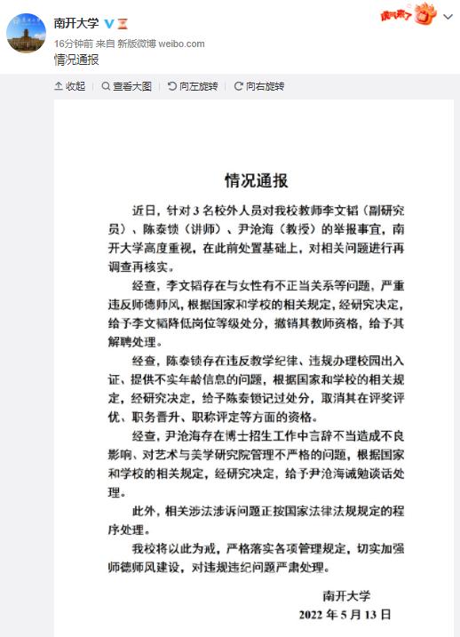 近日,南开大学多名老师被实名举报,引发社会广泛关注。5月13日下午,南开大学官微发布通报:近日,针对3名校外人员对该校教师李文韬(副研究员)、陈泰锁(讲师)、尹沧海(教授)的举报事宜,南开大学高度重视,在此前处置基础上,对相关问题进行再调查再核实。