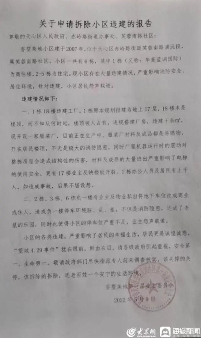 业委会申请拆除“违建”。受访者供图记者注意到,2014年就有媒体对华菱蓝调国际“空中加工厂”进行报道。报道称,“空中加工厂”未向相关部门申请登记,是违章建筑,街道办工作人员介绍,此前有业主举报过华菱蓝调国际违章建筑一事,城管部门也前往进行了制止,没想到他们悄悄加了层,城管部门正积极联系建筑方,就违建一事进行处理。