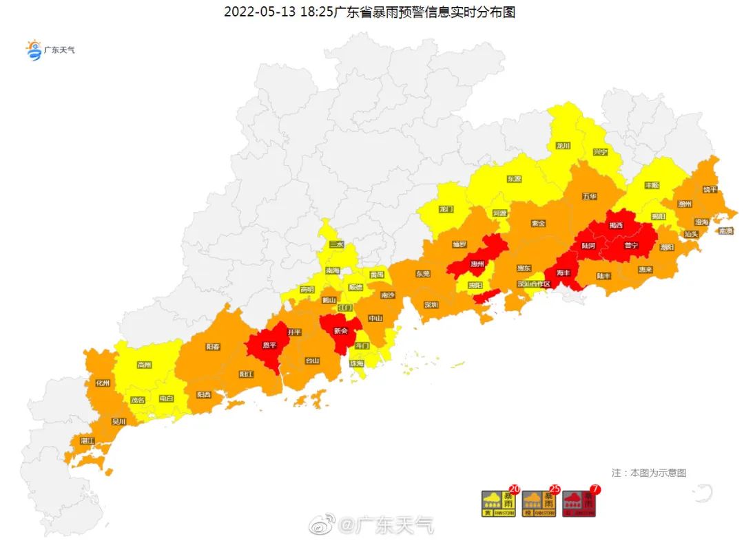 截至13日18:25,恩平、新会、惠州、海丰、陆河、揭西、普宁生效暴雨红色预警,另有25个市县生效暴雨橙色预警,20个市县生效暴雨黄色预警,主要集中在沿海一带,请注意防御。据@广东天气: