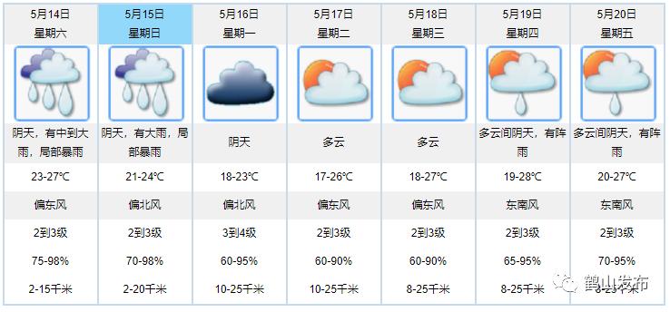 预计今晚到明天,鹤山阴天,有中到大雨,局部暴雨,气温23到27度,偏东风2到3级,相对湿度75%到98%;15日有大雨,局部暴雨;16日起降雨减弱。16至18日受冷空气影响,北风加大,早晚转凉,日间阳光露脸。我市近日出现持续性强降水,土壤含水量高,城乡积涝和地质灾害风险极高,特别是居住在低洼地区、山坡、土坡边的住户,更要加强防御。(鹤山市气象台05月13日16时37分发布)