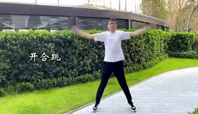 动作要领:双脚向外张开跳起,双手同时高举过头到接近头顶正上方的位置。锻炼目的:提高上下肢协调性,是一种中等强度的热身活动。