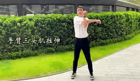 动作要领:内侧手抬平,外侧手手腕与内侧手肘关节交叉,用力拉伸。锻炼目的:对肱三头肌进行拉伸与放松。