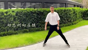 动作要领:向侧方迈出一大步,重心向一侧下压至最低,双手于身前保持平衡。锻炼目的:对双腿内侧肌群进行拉伸与放松。