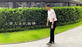 动作要领:一侧小腿向前迈出半步,膝盖伸直并勾脚尖,另一侧腿自然下蹲。锻炼目的:对小腿三头肌进行拉伸与放松。