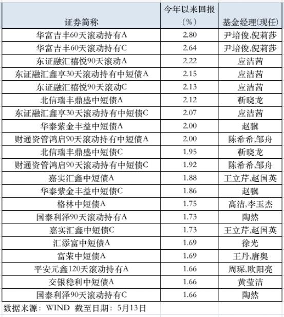 之所以能够吸引投资者的注意,还取决于中短债基金的业绩表现。Wind数据显示,截至5月13日,华富吉丰60天滚动持有中短债基金A今年以来的收益率为2.80%;同期,中证综合债指数的收益率为1.09%,该基金为年内表现最好的中短债主题基金(剔除QDII,下同)。同时,东证融汇禧悦90天滚动A、北信瑞丰鼎盛中短债A、东证融汇鑫享30天滚动持有中短债A、华泰紫金丰益中短债A等8只基金年内收益率也超过2%。总体上,短期纯债基金年内平均收益率为1.08%,而近七成中短债基金的收益率均超过这一水平。