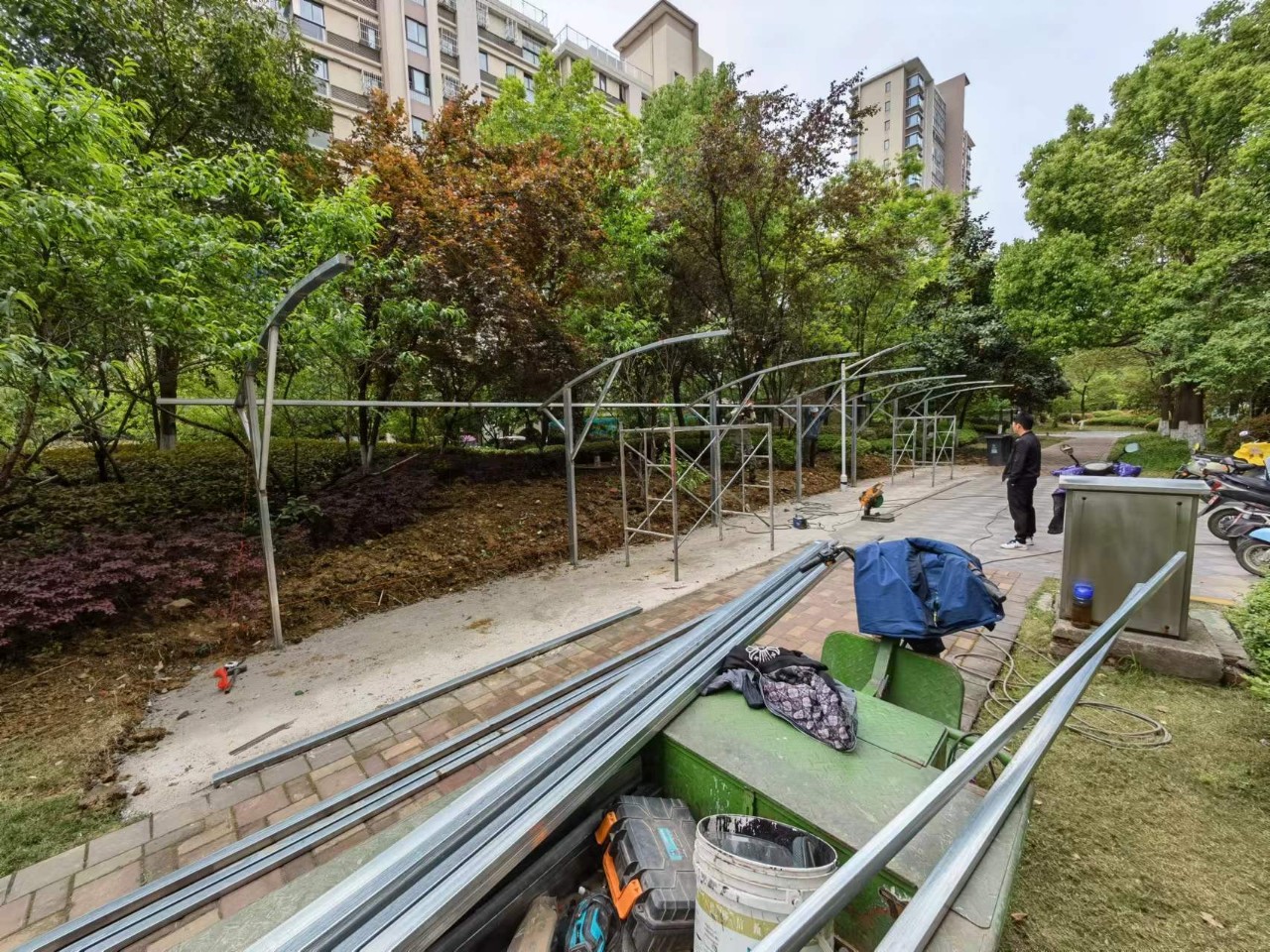 ▲柏庄春暖花开小区正在建设的充电车棚。凌德庆表示,主管部门、街道及社区、业委会和物业公司都须要积极促成此事,他还特别强调,在建设充电设施的时候,一定要保证“高质量、高标准”,以防火灾的发生。