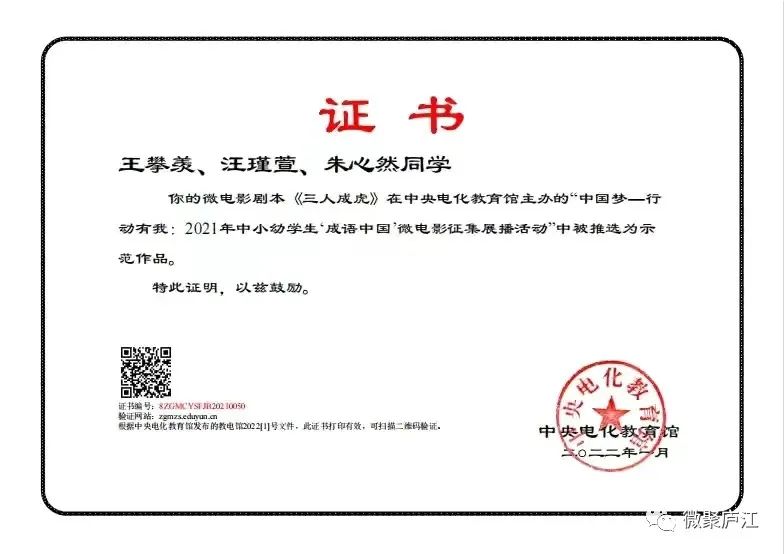 近日,中央电化教育馆组织开展的“中国梦——行动有我:2021年度中小幼‘成语中国’微电影征集展播活动”评选结果揭晓,我县城南小学两部作品入围,其中周鹭婷和丁婉婉老师指导的成语微电影《三人成虎》被评为示范作品。