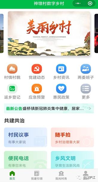 今年以来。盛桥镇以神墩村为试点,积极与县联通公司、信锐科技公司展开合作,围绕神墩村实际情况进行多轮调研,不断优化功能分区,最终历时3个月开发的“神墩村数字乡村”小程序正式上线。神墩数字乡村平台依托大数据、云计算和智慧AI技术实现了“一屏观全村、一网管全村”,让党的政策理论宣传、产业发展、社会治理、民生服务等更加数字化、便捷化和高效化。