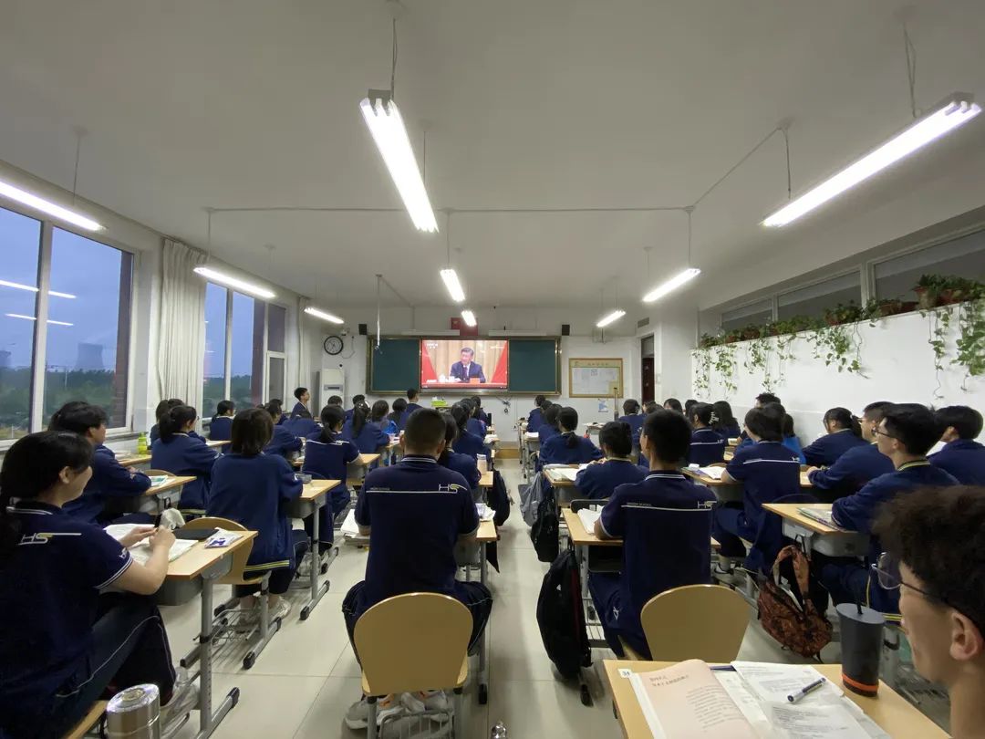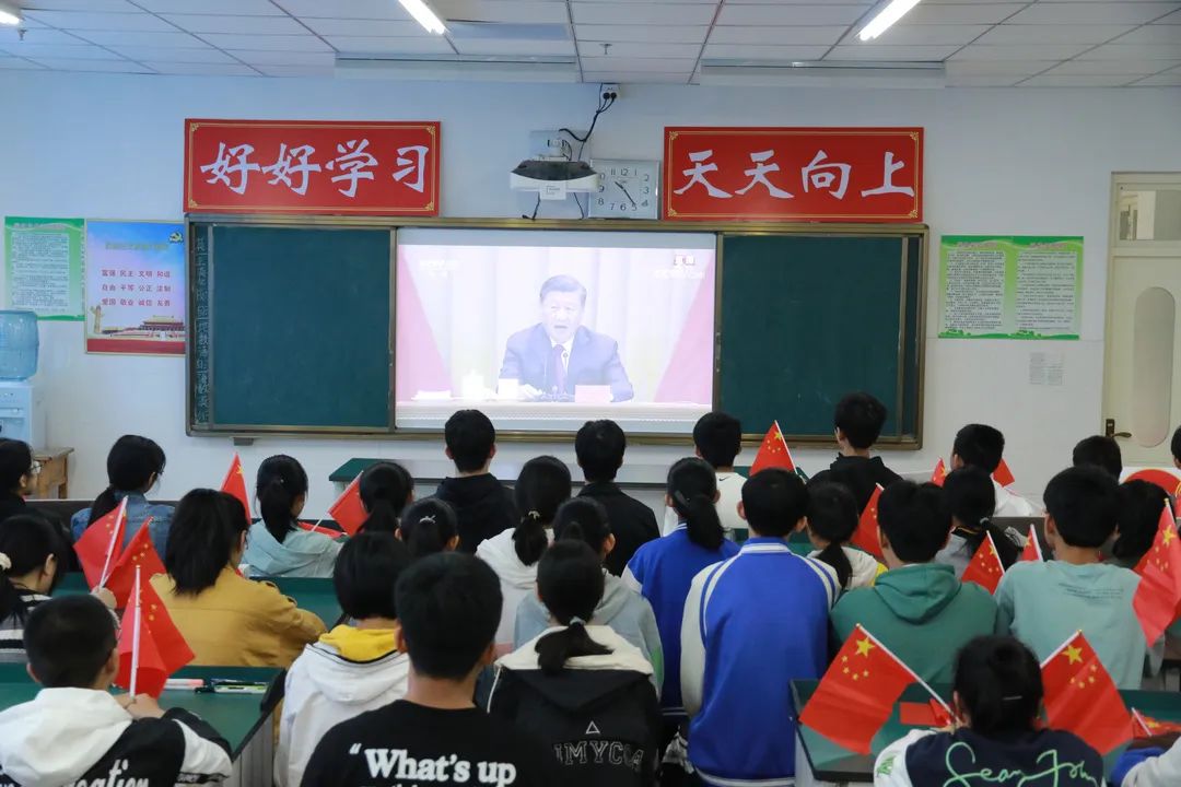 ▲5月10日,高密市第五中学的中学生通过网络电视收看庆祝中国共产主义青年团成立100周年大会直播实况。(高密市第五中学供稿)