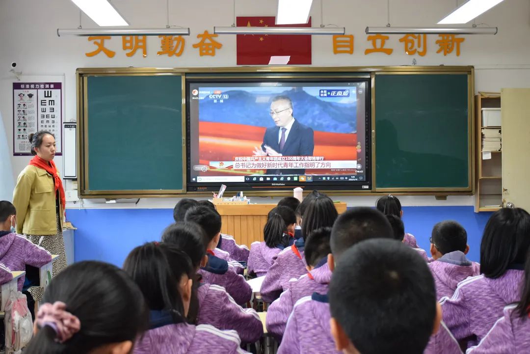 ▲5月10日,诸城市兴华小学组织全校师生观看了“庆祝中国共产党青年团成立100周年”直播节目。(诸城市兴华小学供稿)