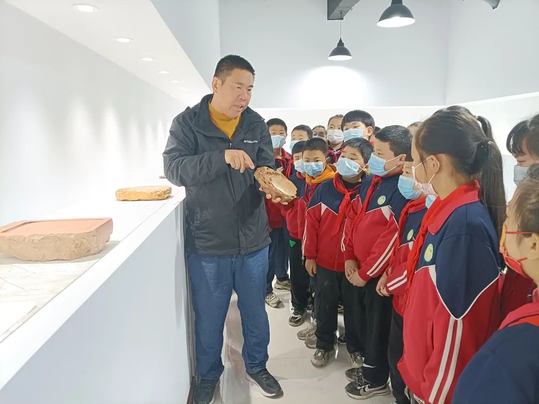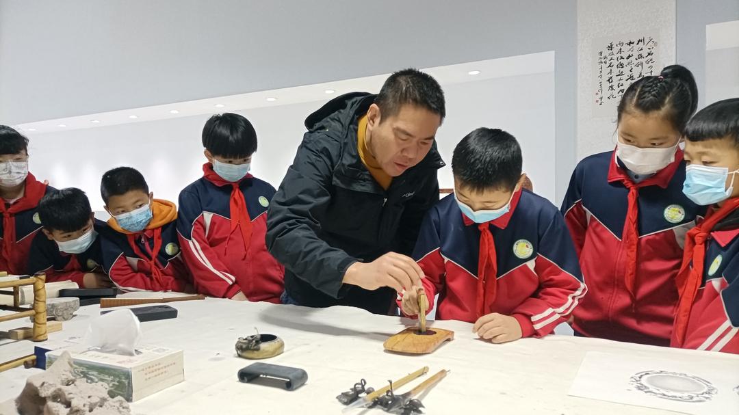 ▲近日,青州市王府街道刘井小学通过走近青州未央红丝砚博物馆、跟博物馆馆长现场学习研磨等形式,让小学生学认红丝石(砚)以及体验砚台研磨的方法。(青州市王府街道刘井小学供稿)