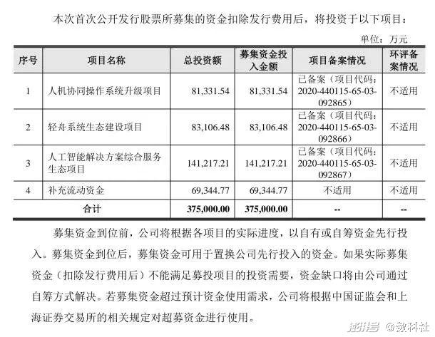 IPO申请书中特意表示,此次云从科技上市,拟融资37.5亿元,计划向人机协同操作系统升级项目投资8.1亿元、向轻舟系统生态建设项目投资8.3亿元、向人工智能解决方案综合服务生态项目投资14.1亿元、补充流动资金6.9亿元。