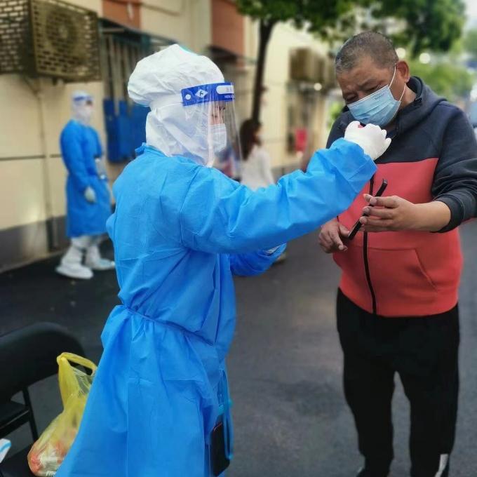 小区没有门铃和电梯,他们只能一户户地敲门,一幢幢地爬楼,雨水打湿了防护服,手套里也被雨水和汗水完全浸湿。在黑暗的楼道里,当她打着手电筒终于协助医生完成全部工作时,已接近凌晨。