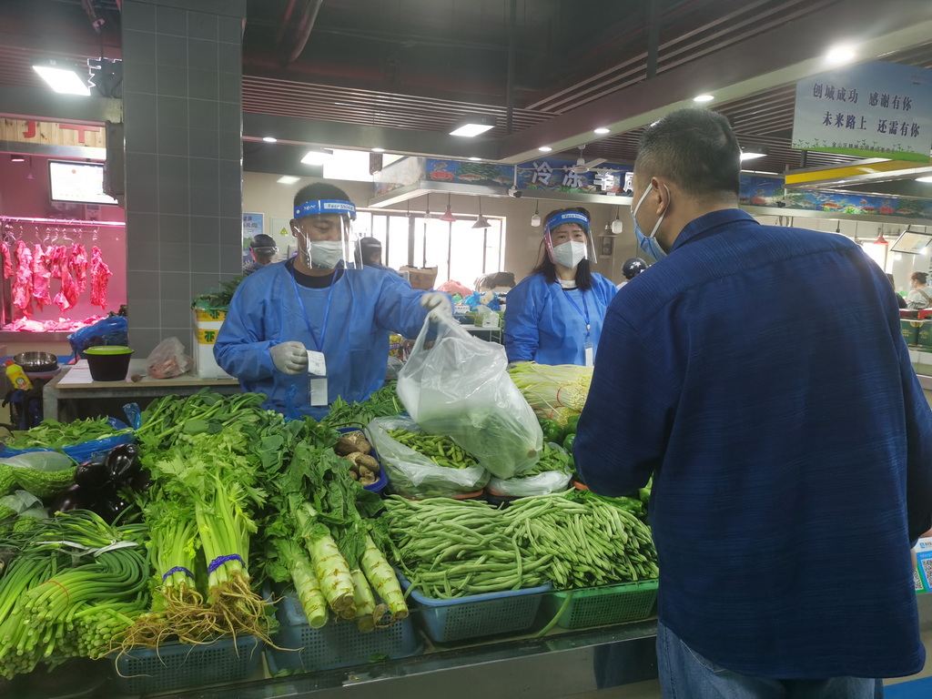 “我们根据面积和人员工作量测算,市场内可同时容纳50名顾客有序进入。”该市场场长戚晨晓介绍,为了防止人员聚集情况发生,市场还成立了巡查队,对人流高的区域进行引导、引流至其他摊位。