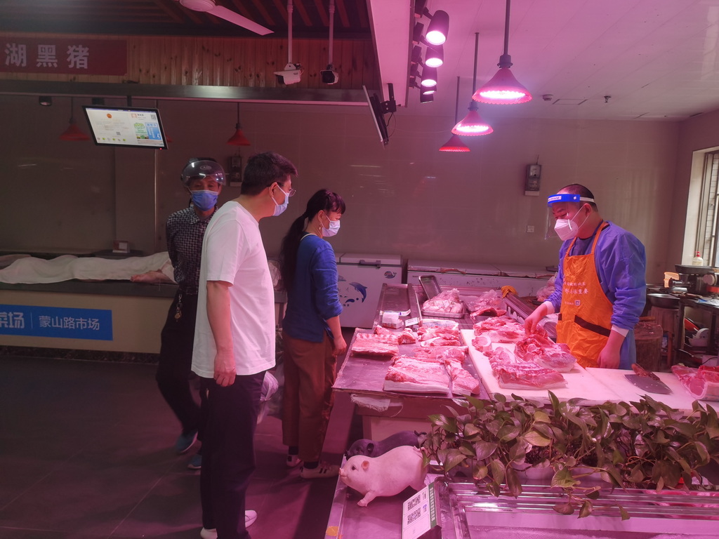 当天,1700多平方米的蒙山路市场恢复线下营业,也是上海市首批恢复线下营业的农贸市场之一。市场内蔬菜、肉类等商品供应充足,价格平稳,经营户和市民均戴口罩,秩序井然,但人流量相对平常少了许多。