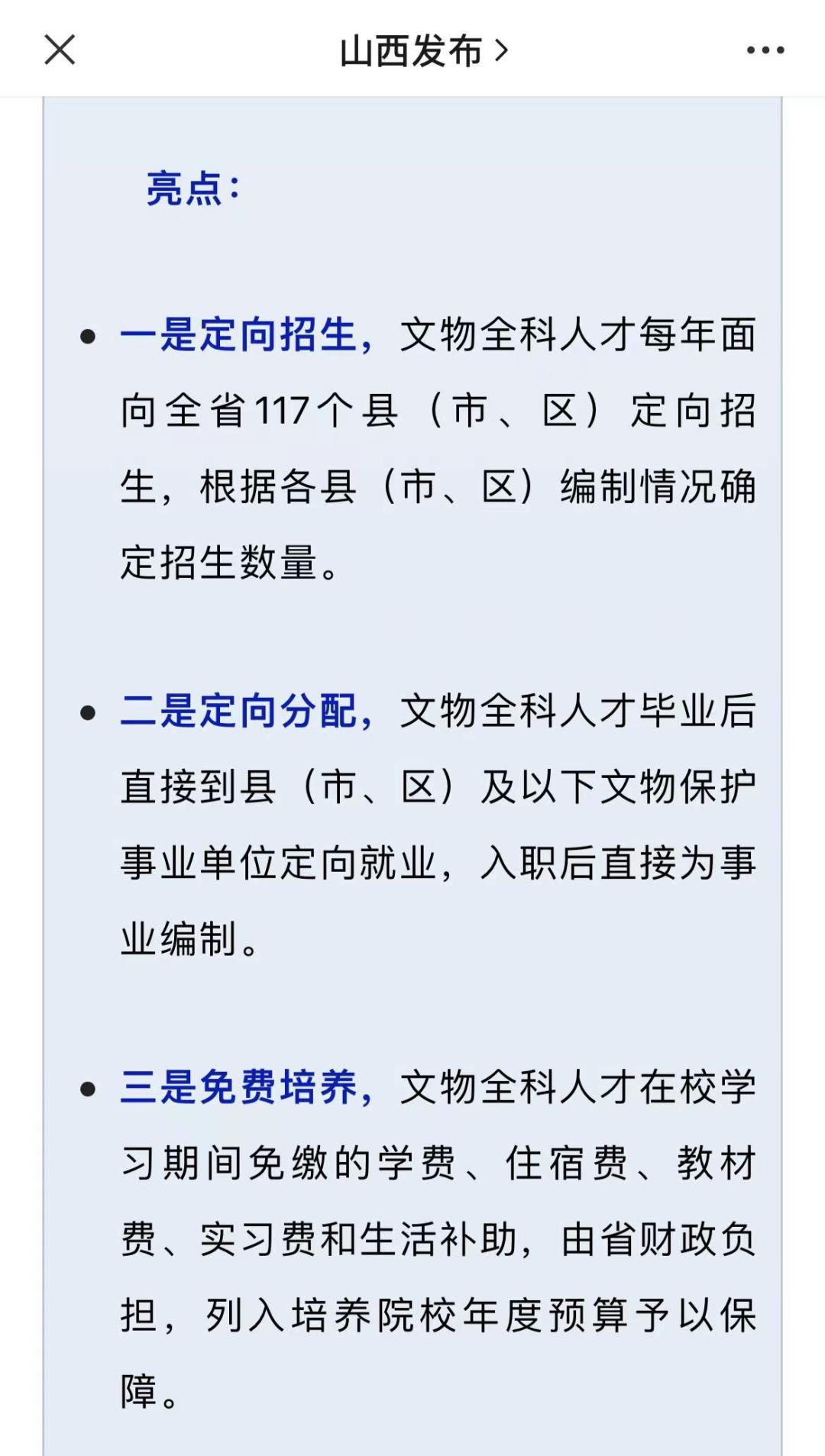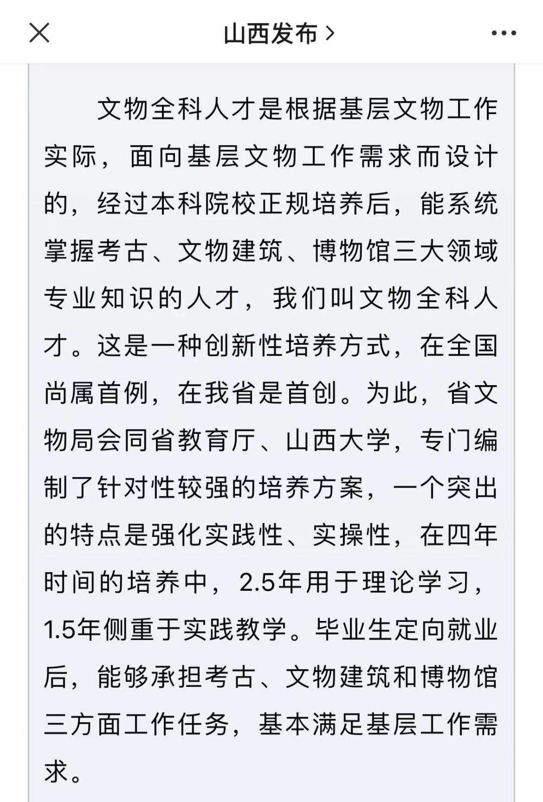 其中指出,山西将用5年时间,通过定向招生、免费培养、定向分配,为县以下基层文博单位输送600名文物全科人才,入职后直接为事业编制。