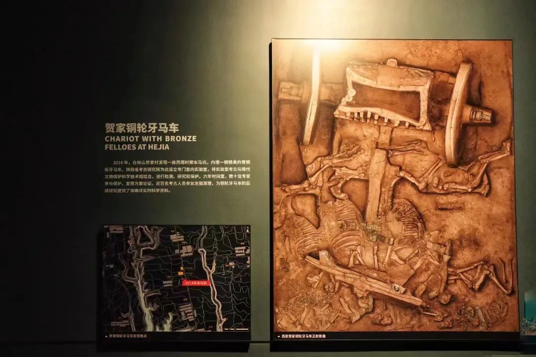 《考古图》,记录了考古学科从诞生到发展成熟的过程。“文物谱系”篇则以时间为序展示了从旧石器时代到西周时期,各种考古文化的分布范围、代表性遗址和代表性文物。最有特色的是周原贺家村出土的青铜轮牙马车遗迹展示区,此处详细介绍了这座马车从田野调查到数字化复原的全过程:它整体迁移而来,经六年发掘清理和复原,才得以面世,被称作“西周第一豪车”。