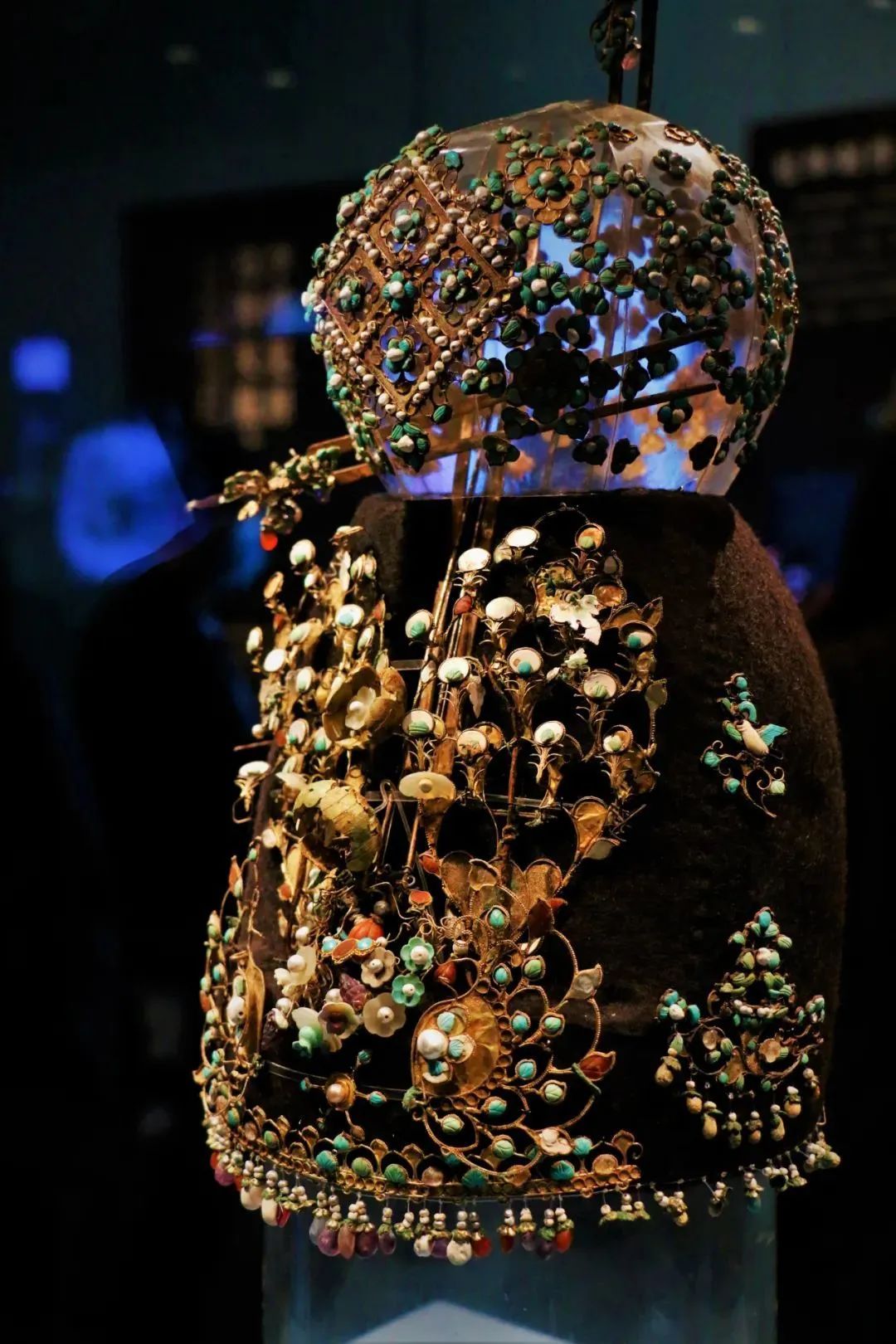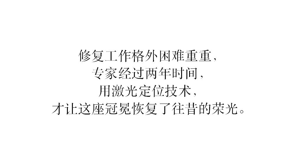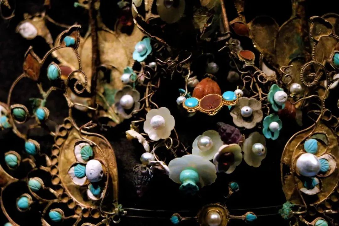 “文保科技篇”则分门别类地展示了对陶瓷、青铜、壁画、纺织品、漆器、玉器等文物的保存、研究和复原。如复原后珠光璀璨的李倕冠冕。李倕为唐代宗室之女,去世时年仅25岁。而她的这尊冠饰在出土时并非现在的模样,由于长期深埋地下,这座冠冕连带头骨被泥土包裹,冠冕的层层材质缠绕在一起,难以分辨每个部件所在的位置。而这件冠冕又造型繁杂、用料庞杂、工艺复杂,是以金铜打底,银丝塑形,嵌以绿松石、红宝石、琥珀、珍珠、玛瑙、贝壳等名贵宝石,单单宝石数量就达370颗。因此,修复工作格外困难重重,专家经过两年时间,用激光定位技术,才让这座冠冕恢复了往昔的荣光。
